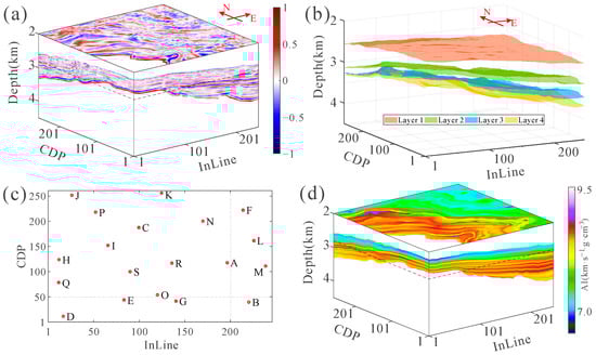 In this study, we perform inversion on a 3D depth-domain field seismic dataset from East China, as depicted in Figure 13a. The seismic data comprises 246 survey lines with a line interval of 0.025 km. Each line has 261 traces or 261 CDP, and the trace spacing is also 0.025 km. The depth ranges from 2.0 km to 4.5 km with a depth sample interval of 0.005 km. The red arrows shown in Figure 13a,b indicate the direction. In this paper, the black dotted lines indicate the actual positions of the slices in 3D figures. Take Figure 13a as an example; the slice shown at the top is a horizontal slice with a depth of 3.3km in the seismic dataset; the situation is the same for the below. Figure 13b shows the four seismic horizons of this seismic dataset. It can be seen that the terrain of this region is high in the southwest and low in the northeast, and layers 3 and 4 are gradually separated along the southwest to northeast direction. There are 19 wells in this region, as shown in Figure 13c, named wells A to Q. And the distribution of wells is relatively uniform. Figure 13d presents the initial AI model established by interpolating the well-log data along the seismic horizons.