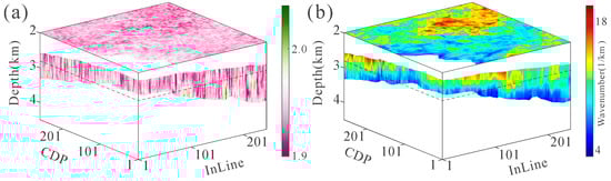 First, our method extracts the generalized seismic wavelet parameters from the 3D depth domain seismic data, as shown in Figure 6. Figure 14a,b show the extracted fractional derivative and reference wavenumber, respectively. The fractional derivative ranges from 1.9 to 2.04, indicating that the shape of the extracted depth-domain generalized seismic wavelet, is close to the Ricker wavelet. The reference wavenumber tends to be lower with increased depth.