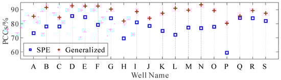The well-to-seismic tie at well N, which aligns the well log and seismic data with the former depth only, is displayed in Figure 16 to verify the accuracy of the extracted wavelets. Figure 16a–c display the well-log velocity, density, and reflectivity. The depth-domain generalized seismic wavelets at the location of well N are demonstrated in Figure 16d, which are constructed using the parameters shown in Figure 14. Figure 16e compares the synthetic seismogram obtained by the depth-domain generalized seismic wavelets (red curve) with the well bypass seismogram (black wiggle variable area), which shows high similarity. The red curve in Figure 16f is the synthetic seismogram obtained by the pseudo-depth-domain constant wavelet, which poorly matches with the actual well bypass seismogram (black wiggle variable area) regarding the waveform and amplitude. Furthermore, the green arrow marks a reverse trend in the synthetic seismogram. The PCCs between the synthetic records and the actual well bypass seismograms are 76.93% and 93.41%, respectively. Similarly, Figure 17 shows the PCCs between the synthetic records and the actual well bypass seismograms for all wells, where the abscissa demonstrates the name of the well, and the blue square and red plus symbol represent the pseudo-depth-domain SPE method and the depth-domain generalized seismic wavelet extraction method, respectively. It can be seen that our method has high accuracy overall. The PCCs of most wells are above 90%. The accuracy of the pseudo-depth-domain SPE method is low, especially that of well P, which is even less than 60%. Therefore, it is proven that our method can accurately extract the depth-domain wavelets from the field dataset.