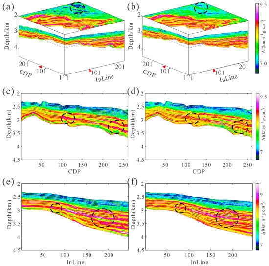 The inverted AI of (a) depth-domain generalized seismic wavelets and (b) the pseudo-depth-domain constant wavelet. (c,e) The profile InLine101/CDP131 of (a). (d,f) The profile InLine101/CDP131 of (b). The red triangle marks in (a,b) indicate the locations of these profiles. The results of depth-domain generalized seismic wavelets indicated by the black circles show higher resolution than those of the pseudo-depth-domain constant wavelet.