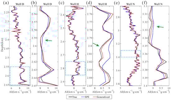 Comparison between inverted AI and well-log AI of wells (a) D, (c) H, and (e) N. (b,d,f) The enlarged view of the cyan box area of (a,c,f), respectively. The black, blue, and red lines represent the well-log AI, SPE result, and result of the proposed method, respectively. The results of SPE method indicated by the green arrows exhibit more dislocation than those of the proposed method.