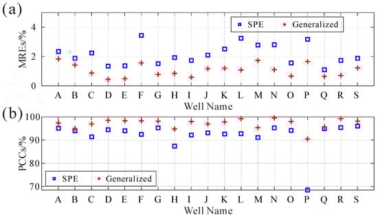 (a) MREs and (b) PCCs between the inverted and well-log AI at the well locations, where the letters are the name of the well.
