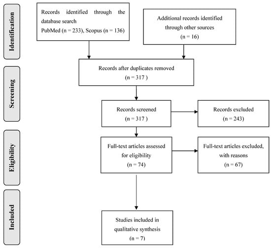 Overall, 385 records were retrieved from the database search. Duplicates and irrelevant studies were excluded; hence, a total of 74 articles were selected. After screening the full text of the articles, 7 studies were eligible for inclusion (Figure 1).