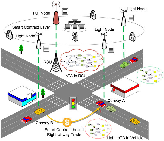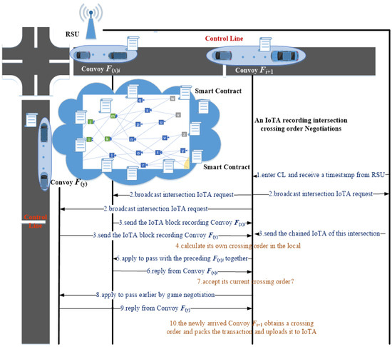 - Once the vehicles enter the CL near the crossroad, each convoy stores the IoTA chain of the crossroad clearance order with the help of RSU. Under smart contract algorithms including gaming, the passing order is negotiated, agreed and strictly followed by all vehicles.