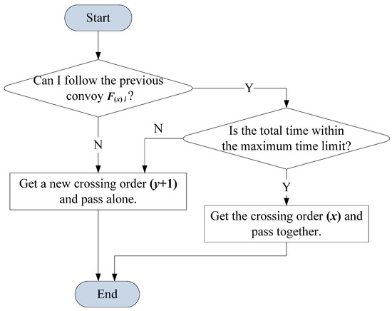 - Maximum Green Light DurationAssume that the start time for the xth passing order direction road to pass is , the actual end time is , and the longest end time for allowance is . So,Suppose that the time when the last vehicle of the next convoy on the same road leaves the crossroad stop line is .If , thenIt is guaranteed that all the convoy will pass the crossroad at this time, and that convoy cannot follow it and will get the latest passing order .If , thenThe convoy receives the passing order and passes the crossroad together with the convoy .