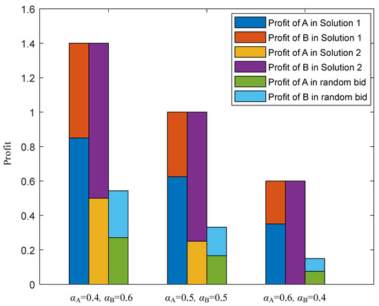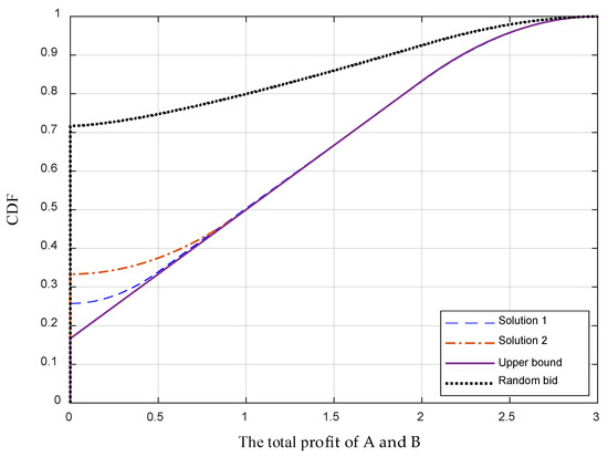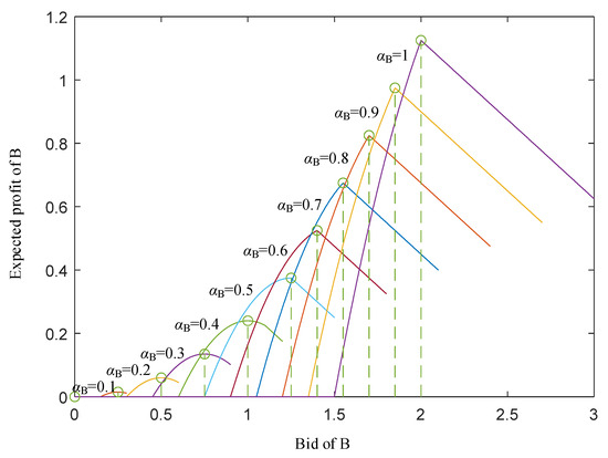 - According to Equation (22) in Section 4.4.1, the optimal bid of A should be equal to , , and B knows the optimal bid strategy of A.