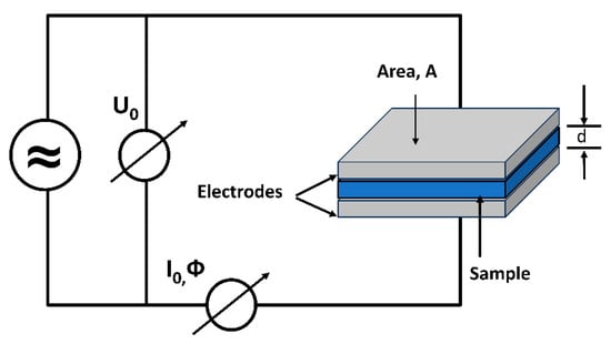 In a regular conductor, the valence band and conduction band overlap, creating a continuous band of energy states that allows charge carriers to move freely. On the other hand, PDMS (Polydimethylsiloxane) is nonconductive, displaying a disordered and amorphous structure, along with a substantial energy band gap [37] which causes the charge carriers to become confined within localized states, giving rise to a phenomenon known as hopping conductance. As a result, charge carriers can only migrate to neighboring empty states by jumping over a potential barrier and using quantum mechanical tunneling [38]. In this study, the conductivity of the PDMS sample was measured using Broadband Dielectric Spectroscopy (BbDS) (Novocontrol Technologies GmbH & Co. KG (Montabaur, Germany)). This technique has been widely employed in the polymer industry to analyze the electrical properties of polymeric materials. The experimental setup, illustrated in Figure 4, involves placing the sample material between two conductive electrodes. The diameter of the electrodes was maintained at 20 mm. A sinusoidal voltage (1 Vrms) is applied to one electrode, while the output current is measured through the other electrode. Depending on the material’s characteristics, the output current can either be in phase or out of phase with the input voltage signal. The conductivity of the material was measured over a frequency range of 1 Hz to 1 kHz at room temperature.