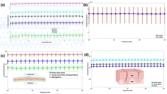 In Figure 5a, we observe an increasing trend of conductivity with increasing CF concentrations. In addition, the conductivity of the composite within the targeted frequency zone is almost constant. From this study, we obtain a functional relation between CF concentration and the conductivity of the composites. Note that by varying the CF concentrations between 1% and 6%, the conductivities of the composite vary somewhere between 10−5 (S/cm) to 10−1 (S/cm). Table 2 shows the known electrical conductivities of different head tissue layers. It can be observed that the conductivities of head tissue layers vary between 10−5 (S/cm) to 10−2 (S/cm). As such, we can process different brain tissue layers with matching electrical conductivities by varying CF concentrations between 1% and 6%. The required carbon fiber concentration for each layer of head tissue is shown in Table 3. The corresponding electrical conductivities of head tissue layers are shown in Figure 5b–d. Figure 5b shows the conductivity of 4-layer and 7-layer head tissue samples. Figure 5c,d highlight the conductivity values of the skull and brain tissue layers. Note the variation in properties between the combined layers and their sublayers. Collectively, the measured conductivities provide various combinations of Electrical conductivity values of different regions of brain tissue as well as the whole tissue.