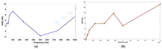 (a) SNR for 1 mV amplitude and varying frequencies. (b) SNR for 10 Hz frequency and varying amplitude.