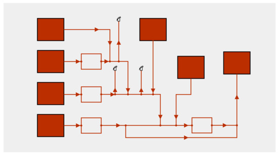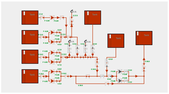 At the initial stage of piping network modeling, we first used advanced drawing software to carefully draw piping schematic diagrams, as shown in Figure 1. In this schematic diagram, large rectangles represent tanks, and thin lines map out the pipes in the piping network. Arrows are used to indicate the direction of fluid flow in the pipes. We used different colors to distinguish pipes and tanks with different functions. In this paper, the color of pipes and tanks is brown for the sewage system, but users can also set the colors inside pipes and tanks themselves, such as generally using red for firefighting water, black for heavy oil, etc. After completing these detailed drawing tasks, we save the piping diagram in SVG format. Then, these SVG image files are imported into the WPF environment as the basic layer for design work. The significant advantage of this method is that it not only allows us to display the piping network layout in a personalized way but also ensures the clarity and accuracy of the SVG vector graphics at various display sizes and resolutions [24]. Furthermore, this method allows programmers to easily adjust and optimize piping diagrams to ensure that they meet the precise requirements of complex piping network system designs.