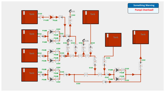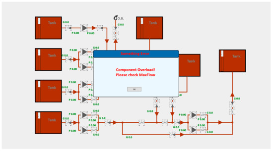 When designing the piping network system, we focus on the visual representation of key components, such as pumps, valves, and monitoring tags, including water level, pressure, and flow. As shown in Figure 2, we developed a set of control styles in WPF and placed them in a reusable resource library. In this example program, flow and pressure are respectively marked with “G” and “P”. Considering that the flow value is relatively large and the pressure is small, the flow value is kept to one decimal place, while the pressure value is kept to two, to facilitate accurate representation. In the piping network diagram, the valve is represented by two opposite triangles. The one-way valve is displayed as one black and one white triangle, with the gray-black part indicating the direction of fluid flow. When the valve is open, the black part will turn to the color of the piping for the operator to intuitively understand. It is worth noting that pumps on actual ships are generally designed with safety valves to prevent the pump or prime mover from being damaged when the pump operates when the discharge piping is not operational (equivalent to infinite system resistance). In this system, pumps are assumed to come with safety valves by default, but when the user only opens the pump and the valve in the direction of the pump inlet, the pump’s pressure will be higher than the pump’s rated pressure, and a warning will pop up (as shown in Figure 3). When the user opens the valve in the direction of the pump outlet so that the pump can work normally, the program will continue to run normally and cancel the warning. If both triangles are white, this indicates that the valve is a stop valve, meaning that the flow is blocked. When the stop valve is opened, the color of the triangles will all turn to the color of the piping. The triangle embedded in the circle represents the pump, and the direction of the triangle indicates the outlet direction of the pump. When the pump is not turned on, it shows a gray-black color and will show the color of the piping when it is opened. The rectangle inside the tank represents the water level tag, providing an intuitive way for the operator to understand the liquid level in the tank. In the design of this program, the upper limit of the tank’s water is 100, the initial water level is 70%, and the water level shown in the water level tag will change with the user’s operation. When the maximum water level is reached, it will be impossible to continue supplying water to the tank, and it will be diverted to other branches. Similarly, when the minimum water level is reached, it will be impossible to take water from the tank. When the pump corresponding to the tank cannot supply water to the tank or take water from the tank, it will be automatically shut down. It is worth mentioning that some tanks operate using fluid gravity (without pumps), and at this time, it is necessary to set the maximum flow limit for the outlet pipe section of the tank, otherwise the program will pop up a warning and stop running, and the programmer will need to check and correct the error before it can continue running (as shown in Figure 4). This detailed graphic design ensures that operators can clearly identify and interpret the various status information in the piping network.