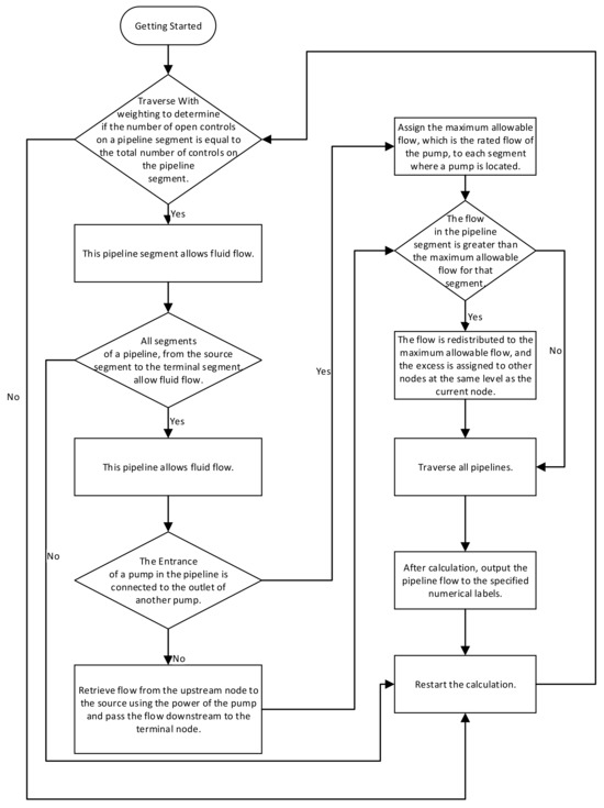 The flow calculation process is detailed as follows. The program, based on the power of the pump and the flow direction of the pipe predetermined in the external Excel spreadsheet, will request flow from the source section starting from the pump inlet. In this process, if the maximum flow provided by an upstream pipe section exceeds the rated flow of the pump, the system will request according to the pump’s rated flow; otherwise, if the maximum flow that can be provided by the upstream pipe section does not reach the pump’s rated flow, it will adjust the request value according to the maximum flow limit of that section. In this process, the flow is temporarily stored at each upstream node of the pump and continues to request upstream until the source is reached.