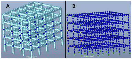 For this analysis, a pushover based on the results obtained from earlier analyses is performed. It was determined that the maximum displacement, according to the non-linear dynamic analysis of the Lorca earthquake, was 5.22 cm. In the inverse approach employed, a sufficiently large displacement was applied to evaluate the gradual formation of plastic hinges. In the present case, a displacement of 25 cm was imposed for time step 100. However, it was observed that by step 22, approximately 100 plastic hinges had already formed (Figure 11A), spanning across all floors of the building.