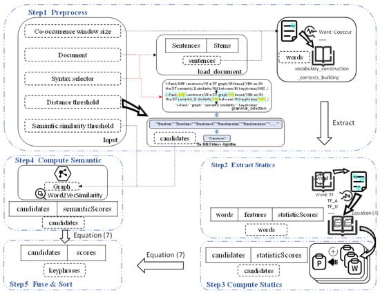 YAKE! [38] can identify high-quality keyphrases and meet all the criteria of phrase quality, which includes a five-step approach to extract keyphases through heuristically combining a set of five statistical features into a unique score, as displayed in (1).
