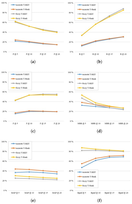 Comparison with Y-Rank and YAKE! (a) Precision. (b) Recall. (c) F-Measure. (d) MRR. (e) MAP. (f) Bpref.