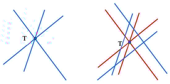 - Three lines (blue) do not intersect at the same point—the right in Figure 1: In this case, we have and the equality in Equation (1) does not apply. We can write instead. In geometrical representation, the observation vector b does not lie in the space spanned by the column vectors of matrix A or cannot be written as a linear combination of the column vectors of matrix A. There is no unique solution as we have three non-consistent equations. The aim is to find the orthogonal projection of vector in the above mentioned space; or in other words, our aim is to transform system (1) to the consistent form with the solution for → and consequently → (the right in Figure 1, red lines), where , for which it would apply that . Therefore, we want to reduce the system rank of by 1.