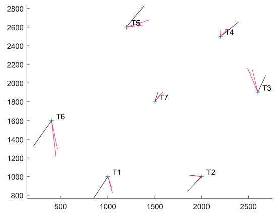 Case 3—vectors of point displacements in a geodetic network (black—free network, magenta—S-transf., LS and TLS_SVD solution, and red—WTLS solution).