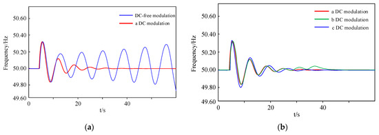 It can be seen from Figure 6a that compared to the system without DC modulation, when DC a and DC c participate in the modulation at the same time, the system frequency oscillation is significantly suppressed, which verifies the effectiveness of the proposed strategy.