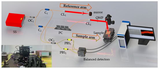 Due to the advantages of non-invasive, high-resolution, and real-time imaging, optical coherence tomography has demonstrated its application in biomedical and clinical medicine. Since its introduction in 1991, OCT technology has been developed for over 30 years []. Various functional OCT technologies have been developed to cater to a wide range of practical applications []. For example, endoscopic OCT, which is OCT together with a well-designed catheter, has already shown the advantages of in vivo imaging for the human body cavity [,]; Doppler OCT, which combines OCT and the optical Doppler effect, provides information on both the internal structure of blood in vessels and the direction of blood flow velocity [,]; OCT Angiography (OCTA) is another method, used to visualize vascular distribution in cardiology [] by analyzing consecutive images to find the changes caused by the movement of blood components []; Optical Coherence Elastography (OCE), which shows the availability of measuring tissue’s elastic properties, through the visualization of the propagation of shear waves and calculation of Young’s modulus []; and polarization sensitive optical coherence tomography (PSOCT), which was designed for biological tissues with birefringence, such as teeth, fiber textures and nerves. For skin burn assessment in surgery, birefringent properties enable differentiation between distinct tissues and the determination of the degree of injury, providing valuable information for medical diagnosis [,,]. In ophthalmology, PSOCT can be used to diagnose ophthalmic diseases due to the birefringent properties of the cornea [,].