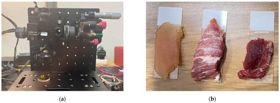 (a) Galvo scanners in the sample arm; (b) the thin slices of in vitro biological samples. From left to right is the chicken breast, pork, and beef.