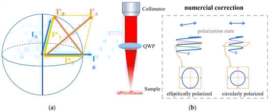 (a) Numerical correction procedure for an imperfect circularly polarized reference; (b) image of the polarization composition of the beam obtained by the sample arm before reaching the sample.