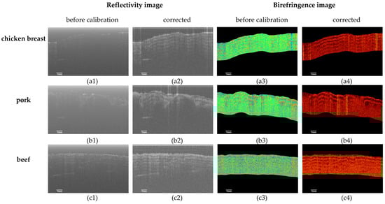 PSOCT images recorded in vitro. The rows from top to bottom show the chicken breast (a), pork (b), and beef (c) in vitro sample imaging. (1,2) (the first two columns) are reflectance imaging. (3,4) (the last two columns) are birefringence imaging. (1,3) show the imaging before calibration, and (2,4) show the imaging after calibration.