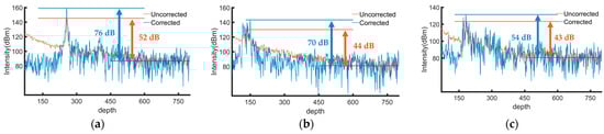 The depth profiles of the intensity signals of a single reflector in the birefringence image before and after calibration were measured to quantitatively analyze the extent of improvement in the images due to the numerical calibration algorithm for circularly polarized light. Each image in Figure 5 contains 1000 such A-lines. The image is mainly presented around depth positions of 100–300. After a depth position of 450, it is beyond the imaging range of the system, and the intensity here is the noise intensity.