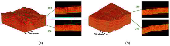 Meanwhile, tissue samples of beef and pork were used to evaluate the imaging capabilities of the Hilbert transform and PSOCT system, resulting in the acquisition of 500 consecutive depth profile images. Numerical calibration was then applied to 1000 birefringence images. These 500 images were sequentially assembled, yielding 3D reconstructions of beef and pork, as illustrated in Figure 7. The side-by-side assembly of the images demonstrates a continuous layered structure. The observable continuity and integrity of the muscle fiber structures in the samples validate the efficacy and accuracy of the proposed circular polarization calibration method and our PSOCT system.