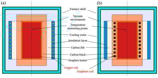 The magnetic-flux density and current density distributions of the two furnaces were compared under the same alternating current size. Figure 6a shows that the orientation of the magnetic induction starts above the coil and loops back below it. The distribution patterns of the magnetic-flux density in both furnaces are predominantly concentrated in the region between the heater and the coil. Following the universal current law, there is a uniform decrease in the magnetic-field strength within a helical coil that is inversely proportional to the increasing radius of the coil. As highlighted in Figure 6b, the induction coil of the graphene-coil furnace has an enhanced internal magnetic-field strength due to its closer positioning to the heater. This arrangement allows the graphene-coil furnace to achieve superior electrical efficiency for the same amount of current.