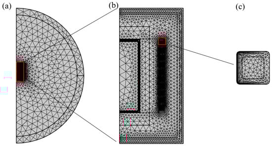 (a) Global mesh structure; (b) detail of furnace body; (c) detail of coils.