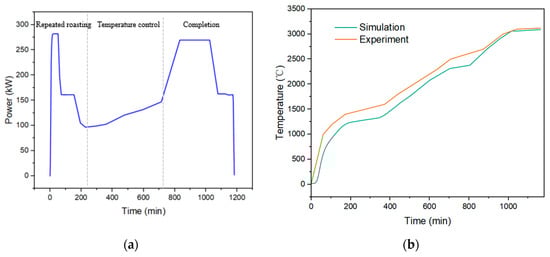 In this paper, we describe the heating procedure used to heat the copper-coil model in a company’s actual production process. The heating regime consists of three stages: repeated roasting, graphitization temperature control, and completion of graphitization. The heating rate of each stage is specially designed based on the kinetic characteristics of the graphitization process of the charge. The power curve is shown in Figure 3a.