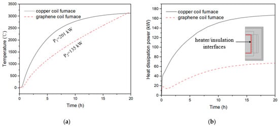 Figure 4b shows the curves of the heat flux versus time at the heater/insulation interfaces for both furnaces. The heat dissipation of the graphene-coil furnace is significantly reduced compared to that of the original furnace. As shown in Equation (14), the graphene-coil furnace has no in-coil cooling water and is further away from the cooling source (T0), so the heat dissipation power is lower for the same temperature difference, which allows it to maintain a higher heating rate in the high-temperature region.