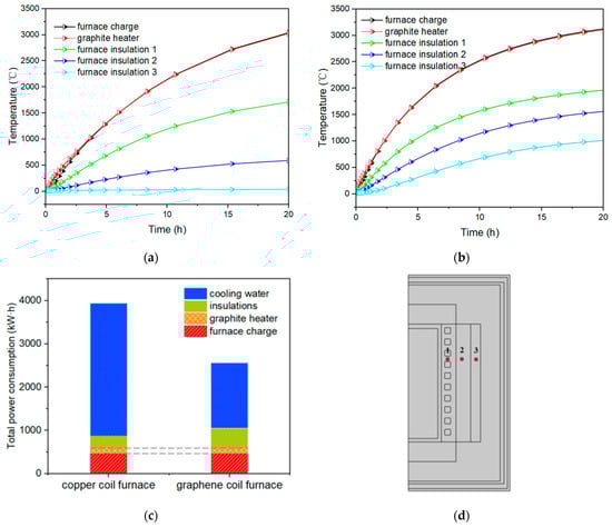 Figure 5a,b show the temperature variation in each part of the two furnaces during the heating process. The energy absorbed by each part during the heating process was calculated, and the energy efficiency performance parameters were derived according to Equation (13); the results are shown in Table 2. In terms of the electrical efficiency, the graphene coil is closer to the heater and the coupling distance between the two is short, which has a higher electrical efficiency compared to the copper coil. In terms of the thermal efficiency, the cold source of the copper-coil furnace is mainly located in the coil (coil cooling water), closer to the heater, while the cold source of the graphene coil is located at the far end of the furnace shell. In addition, the ohmic heat of the graphene coil is also used in the heat insulation of the heater, and thus the insulation performance is better. Taken together, only 12.02% of the coil input energy is absorbed by the heated charge in a conventional copper-coil induction furnace, while the graphene-coil furnace has an energy efficiency of 17.67%. As shown in Figure 5c, to heat the same mass of charge, the energy absorbed by the cooling water in the former furnace is 1506 kWh higher than that in the latter furnace, which has a higher temperature at the end of heating the insulation layer and absorbs 314 kWh more energy.
