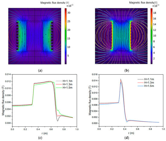 (a,b) Magnetic-flux density distribution; (c,d) flux density distribution along x-direction for different Hs.