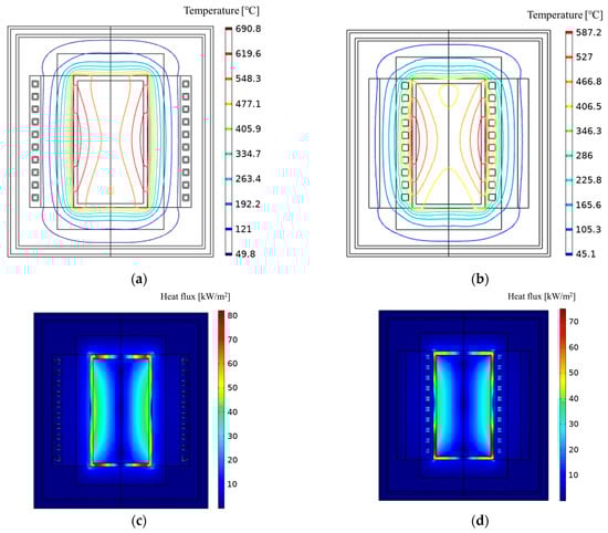 (a,b) Isoline of temperatures of two furnaces. (c,d) Heat-flux distribution of two furnaces.