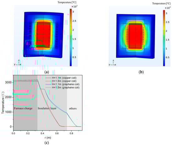 As shown in Figure 9b, the temperature distribution along the r-axis is divided into three parts: the furnace charge zone, insulation layers, and other spaces. Due to the high thermal conductivity of the charge, the temperature distribution inside the charge is more uniform, and the temperature of the graphite heater is slightly higher than that of the charge. Inside the insulation layers, the temperature distribution curve along the r-axis takes the form of a concave function. This is due to the fact that, under the condition of a near-steady state in the late stage of heating, the area through which the heat flows from the inside of the insulation to the outside increases with the r, which means that the temperature change becomes smaller and smaller with the distance from the inside, and thus the temperature curve tends to be flat. For the graphene-coil furnace, the temperature gradient inside the insulation is much smaller because the coil losses are used for heat insulation, which explains its lower heat flux at the heater/insulation interface in the later stages of heating.