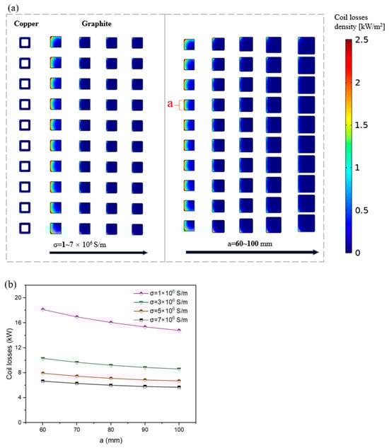 Given that the electrical conductivity of GCMs is still lower than that of copper, it is important to pay special attention to the coil losses. The ohmic heating of the current can be calculated using Equation (11), which takes into account the skin loss and the neighbor loss of the high-frequency current. The effects of the coil size and conductivity on the coil losses are discussed in this study. The side length of the square coil was varied from 60 mm to 100 mm, while the conductivity of the graphene coil was varied from 1 to 7 × 106 S/m. It is clear from Figure 10a that the coil losses are not uniformly concentrated in the interior of the conductor. For coils of the same cross-sectional area, the area of coil losses decreases as the conductivity of the coil material increases. For the same coil with a conductivity of 1 × 106 S/m, increasing the cross-sectional area shrinks the region of high losses. It should be noted, however, that because the distance between the coils is fixed, the proximity effect is enhanced as the distance between the coils decreases with the increasing coil area. Therefore, increasing the tube radius will reduce the skin effect while increasing the proximity effect.
