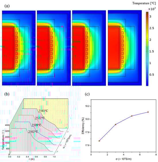 (a) Temperature distributions of induction furnace for different coil conductivities. (b) Temperature distributions along r-axis. (c) Effect of coil conductivity on energy efficiency.