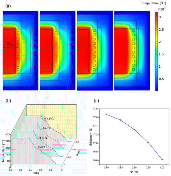 Figure 12 shows how the coil’s temperature and the induction furnace’s energy efficiency are influenced by the coil’s distance from the graphite heater, represented by the coil diameter (Φ) ranging from 0.8 m to 1 m. As the Φ increases, the coil-heater gap widens, leading to a notable coil temperature drop after 20 h of heating—from 2561 °C to 1870 °C. Notably, at Φ = 0.85 m, the coil temperature decreases to 2342 °C, falling within a safe usage range. Figure 11c reveals that the furnace’s energy efficiency diminishes as the Φ grows. The analysis indicates that a larger coil-heater distance reduces the electrical efficiency of the induction heating, impacting the overall heating performance. Hence, for the optimal energy efficiency and coil lifespan, a coil diameter of Φ = 0.85 m is recommended for the model.