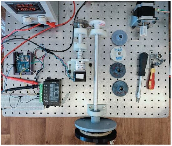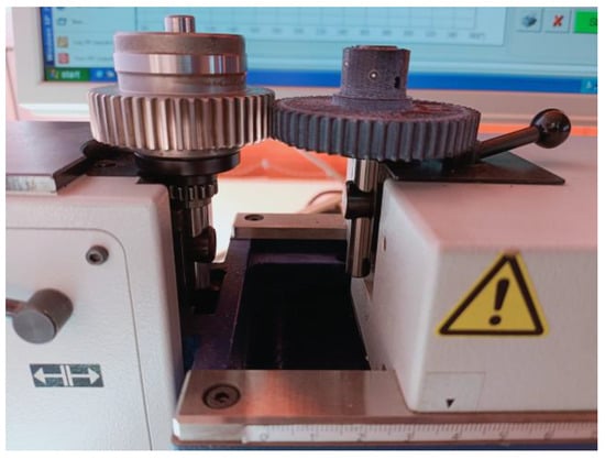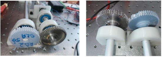 In order to identify the level of wear that appears on the gears made by additive technologies, an experimental setup was designed and realized. The stand consisted of: an ARDUINO type development board, a bipolar stepper motor with a gear reducer that supported a maximum torque of 3 N·m; a TB 660 driver with a maximum current of 4A; and a mechanical system for gearing and requesting the gears, consisting of two shafts (Figure 2). A pulley-type wheel with a diameter of 150 mm was fixed on the driven shaft, on which a wire was wound. At the free end of the wire, the weights were fixed. The setup allowed for loading two gears with a maximum torque of 1 N·m. Changing the weights allowed for strict control over the load. Considering the gears, a metal reference gear and gear made by additive technologies were used. The reference gear was made in the Q = 7 quality class, with a modulus, m = 1 mm, number of teeth, z = 56, and the same gear thickness as the workpieces, b = 12 mm. The reference steel workpiece gear was manufactured on a special gear-cutting drill machine.
