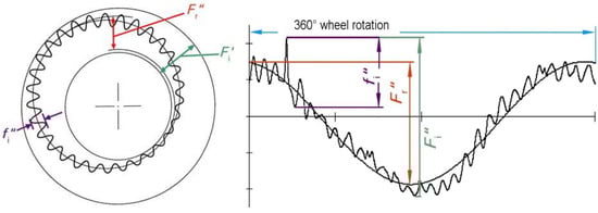 - The runout deviation by the composite test Fr” is the value of radial runout of the gear between the maximum and the minimum radial distance from the gear axis as observed by removing the short-term or undulation pitch deviations and analyzing the long-term sinusoidal waveform;