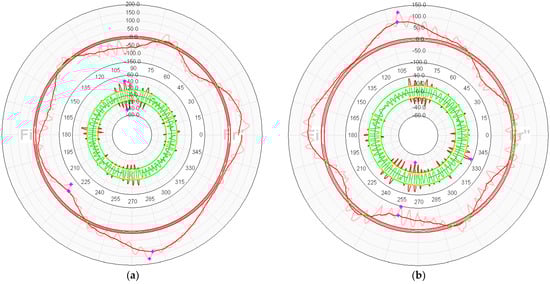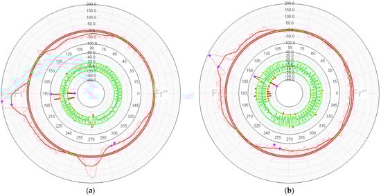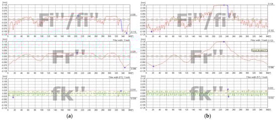 The gears were evaluated on the ZWP 06 FRENCO before the load tests (BT) and after the load tests (AT). The master gear () had, of course, a modulus of mm = 1 mm, number of teeth zm = 48, gear thickness of bm = 15 mm, and gearing angle of α = 20° (Table 3).