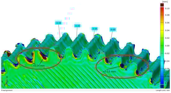 Analyzing the 3D-scanned model in detail (Figure 11), the differences between the two conclusions, which, in a first analysis, are contradictory, can be justified. The increase in the “Fi” was registered due to the fact that the load applied during testing generated a high degree of damage to the gear. The thicknesses of the gears from the test stand (the metal gear and the polymer gear under test) are identical and the high loads generated micro displacements of the material at the level of the tooth.