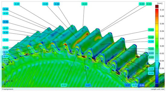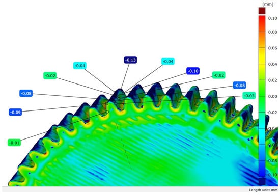 The results obtained after the evaluation by scanning the PLA and ABS gears support the conclusions obtained after the evaluation of the samples on the ZWP 06 FRENCO machine and provide additional information on the evolution of wear at the level of the teeth. For both gears, PLA and ABS, the highest degree of wear was recorded at the level of the tip of the teeth (Figure 10 and Figure 11). For the PLA gear, the values recorded for wear on the 3D-scanned model show an average of −0.03 mm (Figure 12).