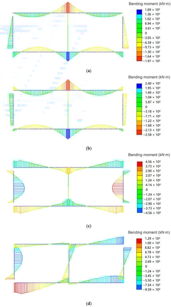 After establishing boundary conditions and implementing loads, the software was executed to carry out an FEA on the box culvert. Figure 18 depicts internal force diagrams representing the bending moments of the box culvert under various working conditions. In particular, the bending moment envelope under the load-bearing capacity limit state of the box culvert is illustrated in Figure 19. A summary of the maximum bending moment values of the corresponding control sections is presented in Table 2.