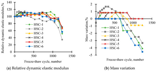 In the case of the reference HSC-1, a mass increase in the specimens was observed before 500 freeze-thaw cycles due to the continued hydration of cement inside the concrete, with a maximum increase of 0.8%. Moreover, the relative dynamic elastic modulus showed a certain degree of improvement due to hydration effects before 100 cycles. Beyond 500 cycles, surface spalling occurred in HSC-1 specimens, resulting in mass loss. However, its freeze-thaw life could still surpass 1200 cycles, aligning with the findings of Cao et al. [21].