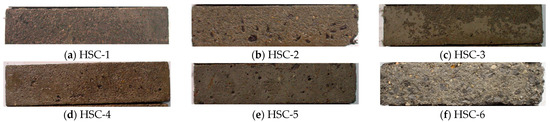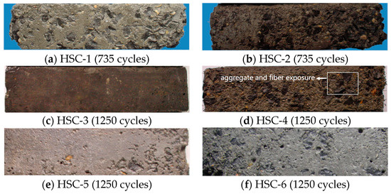 Figure 3 shows the variation in specimen mass and surface damage after 1250 freeze-thaw cycles for HSC with different mix ratios. The concrete specimens in Figure 3a–f exhibit surface sanding and spalling of the hardened cement paste. Additionally, HSC-2 in Figure 3b displays dropped corners, while HSC-6 in Figure 3f exhibits spalling of the mortar, exposure of the coarse aggregate and fibers, and end-breakage.