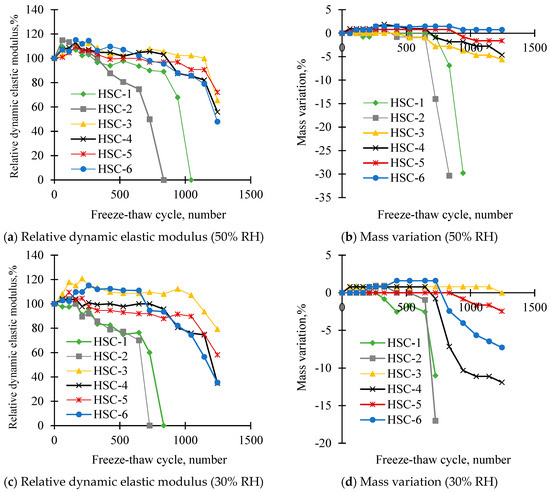 For the reference HSC-1 cured at 30% RH and 50% RH after 850 freeze-thaw cycles, there is a notable acceleration in the decrease of the relative dynamic elastic modulus and the rate of mass loss. Moreover, the drier the curing environment, the poorer the freeze-thaw resistance. This demonstrates the sensitivity of HSC’s freeze-thaw resistance to the RH of the curing environment.