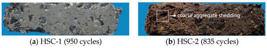 Figure 5 displays the mass loss and surface damage of HSC with varying mix ratios after undergoing freeze-thaw cycles under 50% RH. HSC-1 and HSC-2, which experienced the most significant mass loss, are used as examples. Figure 5a displays mortar spalling, exposing a large area of coarse aggregate and causing damage and detachment at the end. Figure 5b shows coarse aggregate shedding, resulting in obvious missing ends and severe damage.