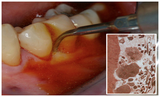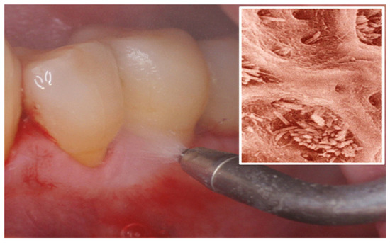 Following the conventional nonsurgical and surgical treatments for periodontal and peri-implant conditions, there are documented instances of therapeutic failures in the existing literature [2,3,4]. The incomplete decontamination of the root or implant surface and adjacent soft tissues is responsible for their presence, which is attributed to the aggressive bacterial biofilm. These bacterial species, including Porphyromonas gingivalis, Treponema denticola, Bacteroides forsythus, Fusobacterium nucleatum, and Peptostreptococcus micros, belong to Socransky’s red and orange complexes [5]. Multiple studies [6,7,8,9,10,11,12,13,14,15,16] have demonstrated that the persistence of these bacteria remains evident even after a year of treatment, regardless of whether the patient undergoes periodontal maintenance therapy every 4–6 months. This recolonization of the periodontal pockets is observed in both nonsurgical interventions and regenerative surgery [2,3]. It can be inferred that the management of advanced periodontitis necessitates the utilization of antibiotic combinations, despite the World Health Organization’s recommendations to reduce their usage to prevent the proliferation of antibiotic resistance.
